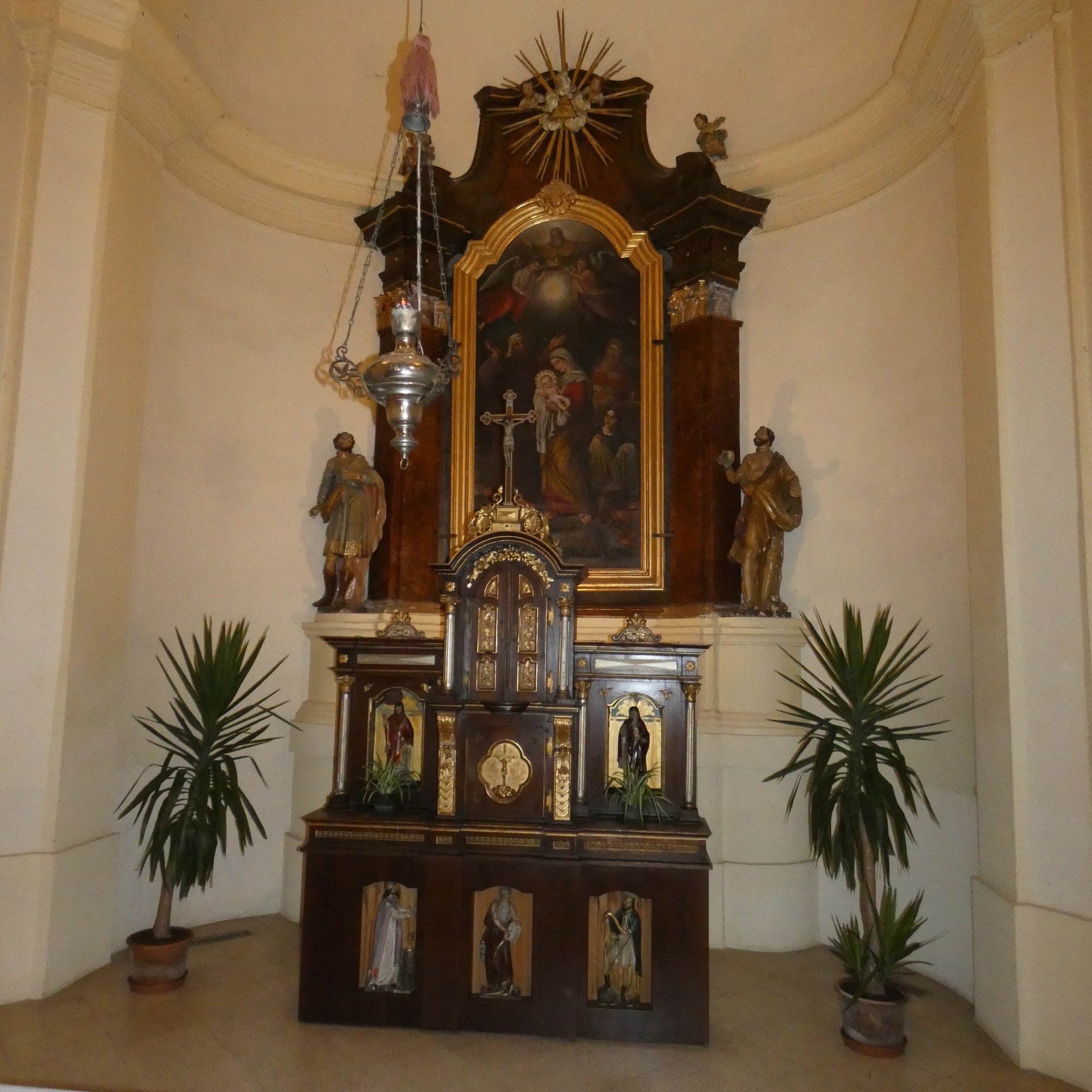 Přibližně orientovaná jednolodní sakrální architektura s konkávně projmutě odsazeným presbytářem a konkávně projmutými nárožími západního vstupního průčelí završeného hranolovou zvonicí. K západnímu průčelí je přistavěna hranolová předsíň se štítem po stranách konkávně tvarovaným a završeným segmentem, k jižnímu bočnímu průčelí přiléhá sakristie protáhlého obdélného půdorysu a k severnímu průčelí je přistavěna kaple Božího hrobu. Loď je zaklenuta plackou na pasech, presbytář plackami na pasech a v závěru konchou, kaple a sakristie jsou plochostropé, hudební kruchta je podklenuta plackami mezi pasy a přistavěná část má rovný podhled na toskánských sloupech.